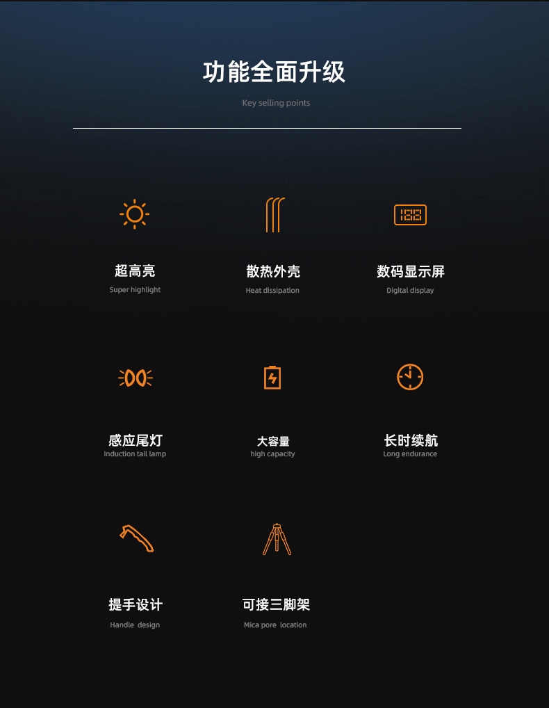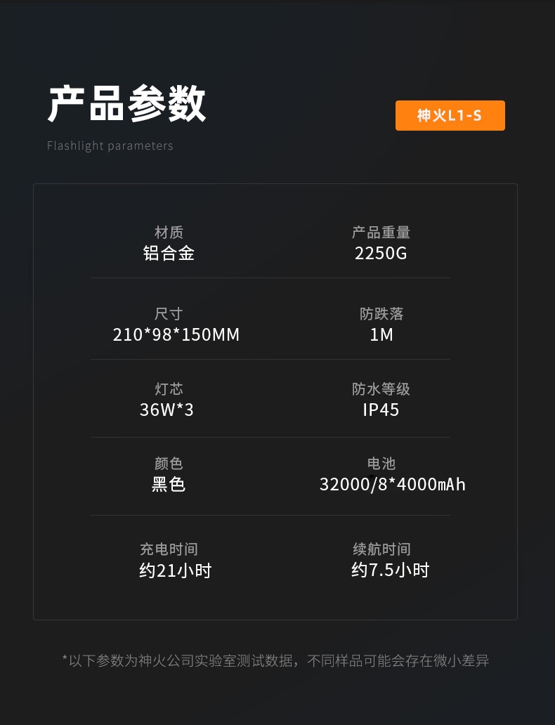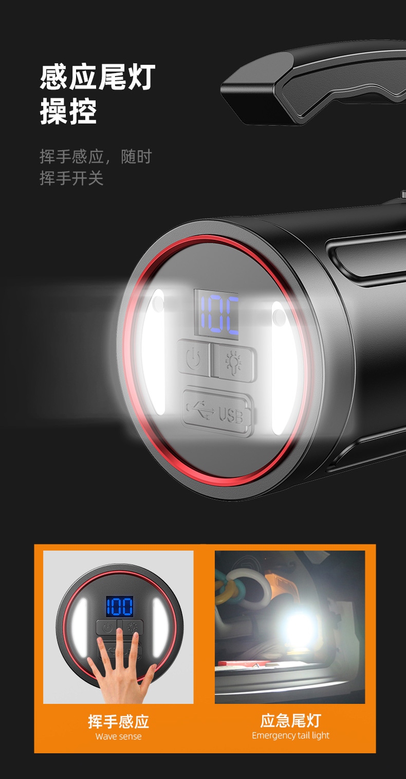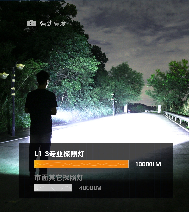 1、超高亮探照燈,最高亮度可達(dá)10500lm,大容量32000mAh電池;
