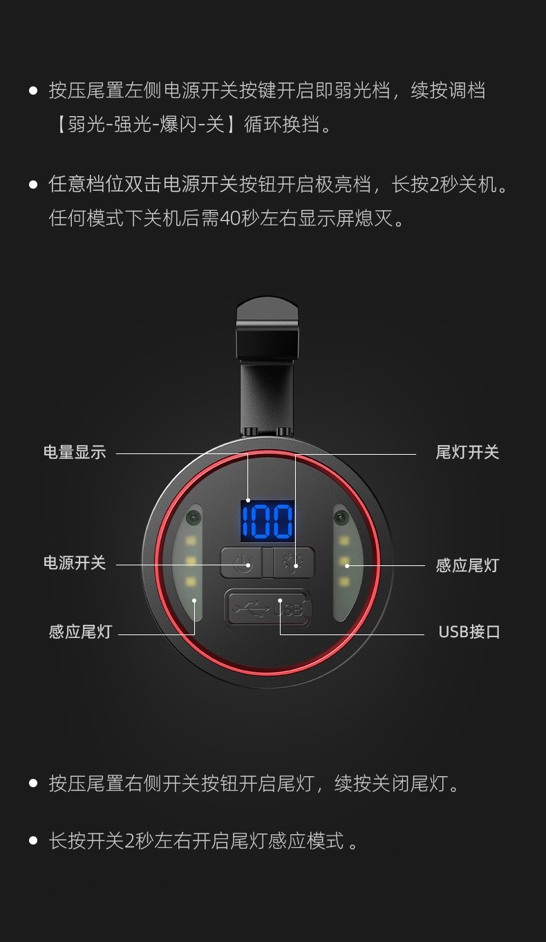 3、按壓尾置右側(cè)開關(guān)按鈕開啟尾燈,續(xù)按關(guān)閉尾燈。長(zhǎng)按開關(guān)2秒左右開啟尾燈感應(yīng)模式(尾燈開啟感應(yīng)模式無法看清 提示,手掃關(guān)閉光源有藍(lán)光提示)。