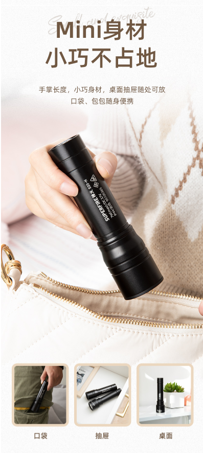 S33系列手電筒身長度131-156cm,筒身直徑27-29cm,重量約85-173g,身材小巧,可一手掌控,桌面抽屜收納不占地,口袋包包隨身易攜帶。