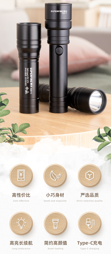 S33系列手電采用優質LED燈芯和鋰電池,出光效率高、散熱快,續航時間較長。其中C20、C20-T采用15W大功率燈芯和4000mAh大容量鋰電池,光通量最高可達1100Lm,遠射距離約240m,強光續航可達4h。