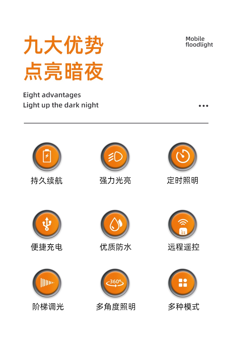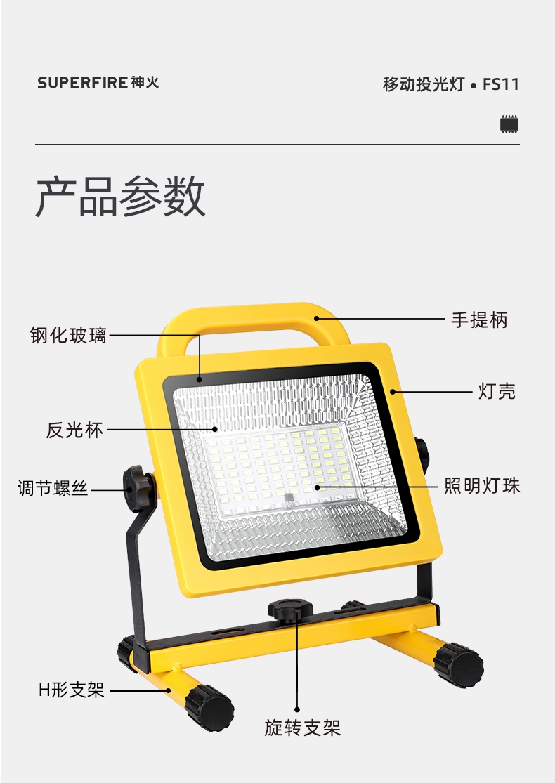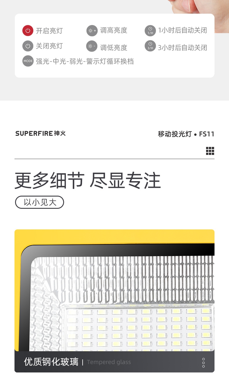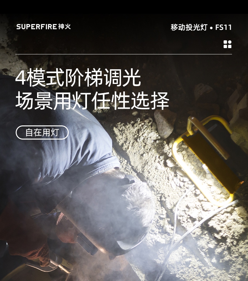 1、多檔調(diào)光,可滿足不同使用場景下的照明需求; 2、含提手,握感更舒適。攜帶更簡單; 3、新型高亮遠(yuǎn)射燈珠,60W大功率,亮度高,照明效果好。