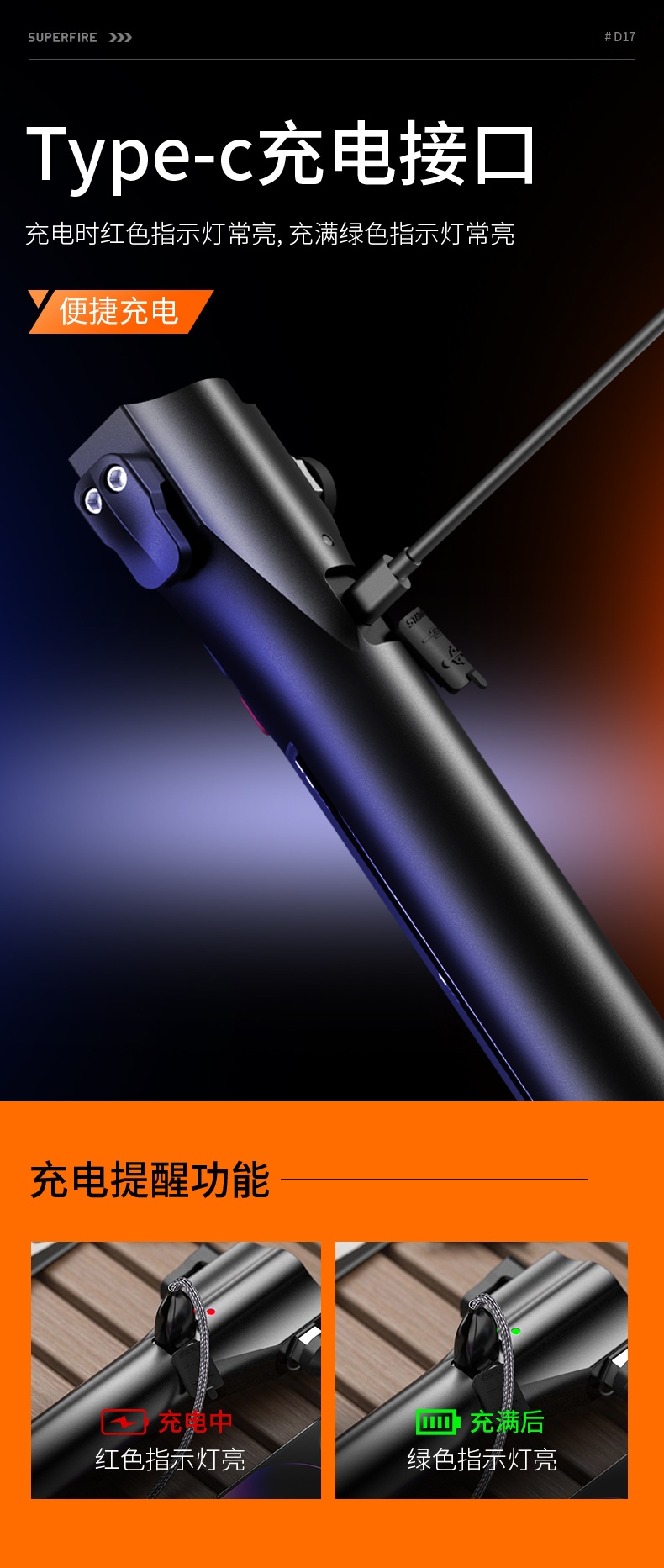 1.單擊左邊開關開啟感應功能,同時開啟強光檔,續按關閉感應功能(關閉感應功能,光源不會關閉),當感應功能開啟時,單擊右邊開關可正常調節檔位。 2.多樣化充電,使用方便:設有Type-c充電口,可使用充電器、充電寶、電腦等設備為燈具充電。 3.電量顯示:實時