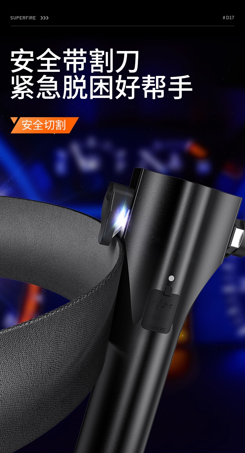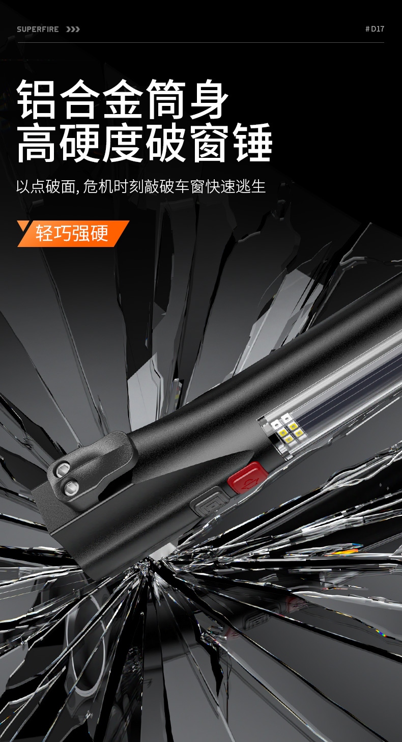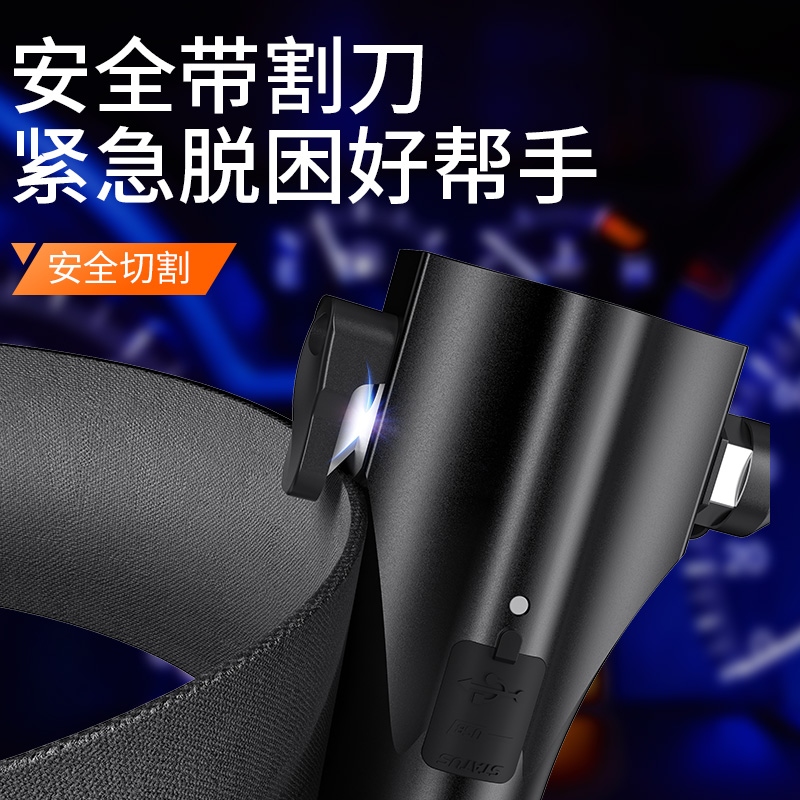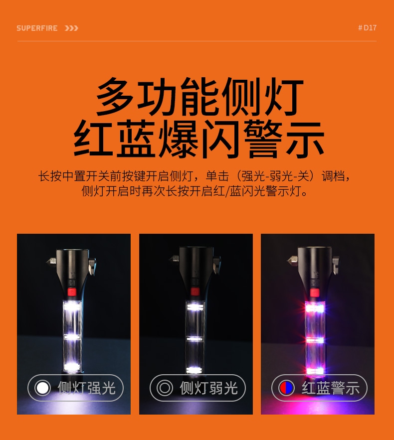 1、側燈LED燈帶紅藍爆閃警示功能。2、帶聲音報警功能,有三種應急警示音。3、側邊帶破窗錘可做應急救生使用。4、側邊帶割刀求生救援必備。5、帶太陽能充電,續航更持久