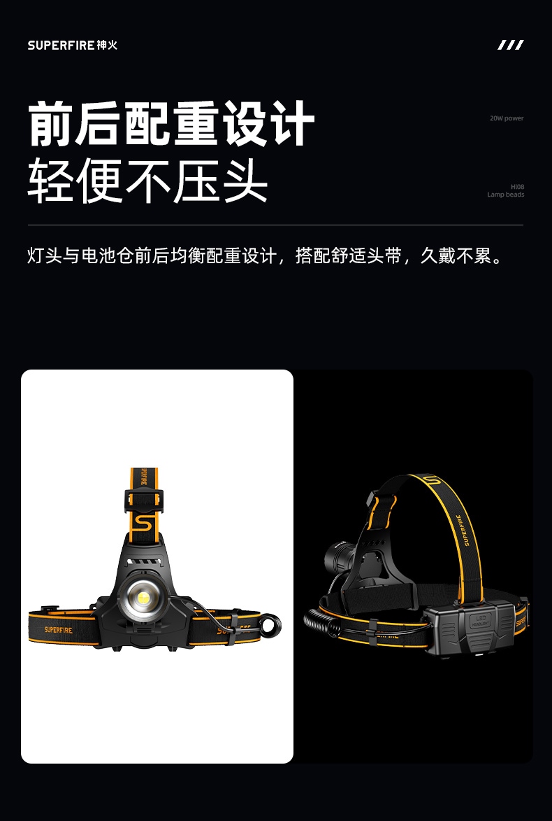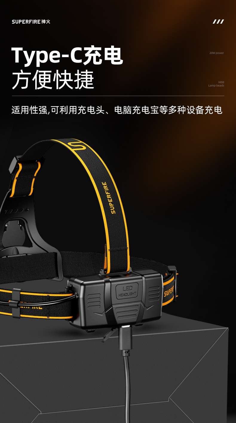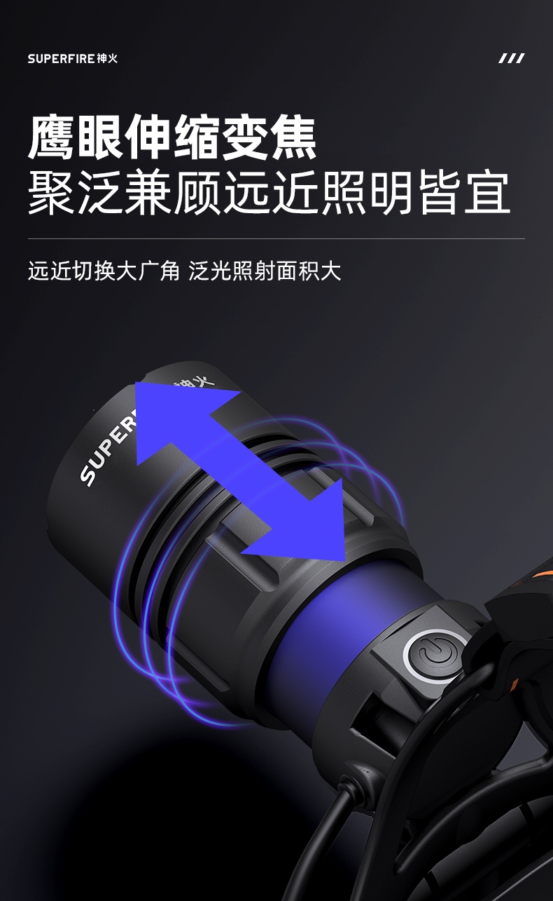 強光亮度,運動頭燈,前后均衡設計,輕便不壓頭,可調節式頭燈帶,佩戴方便舒適,伸縮調焦,光照范圍大,照射距離遠,頭燈角度調節,超90度角度隨意調節,適宜各種環境使用