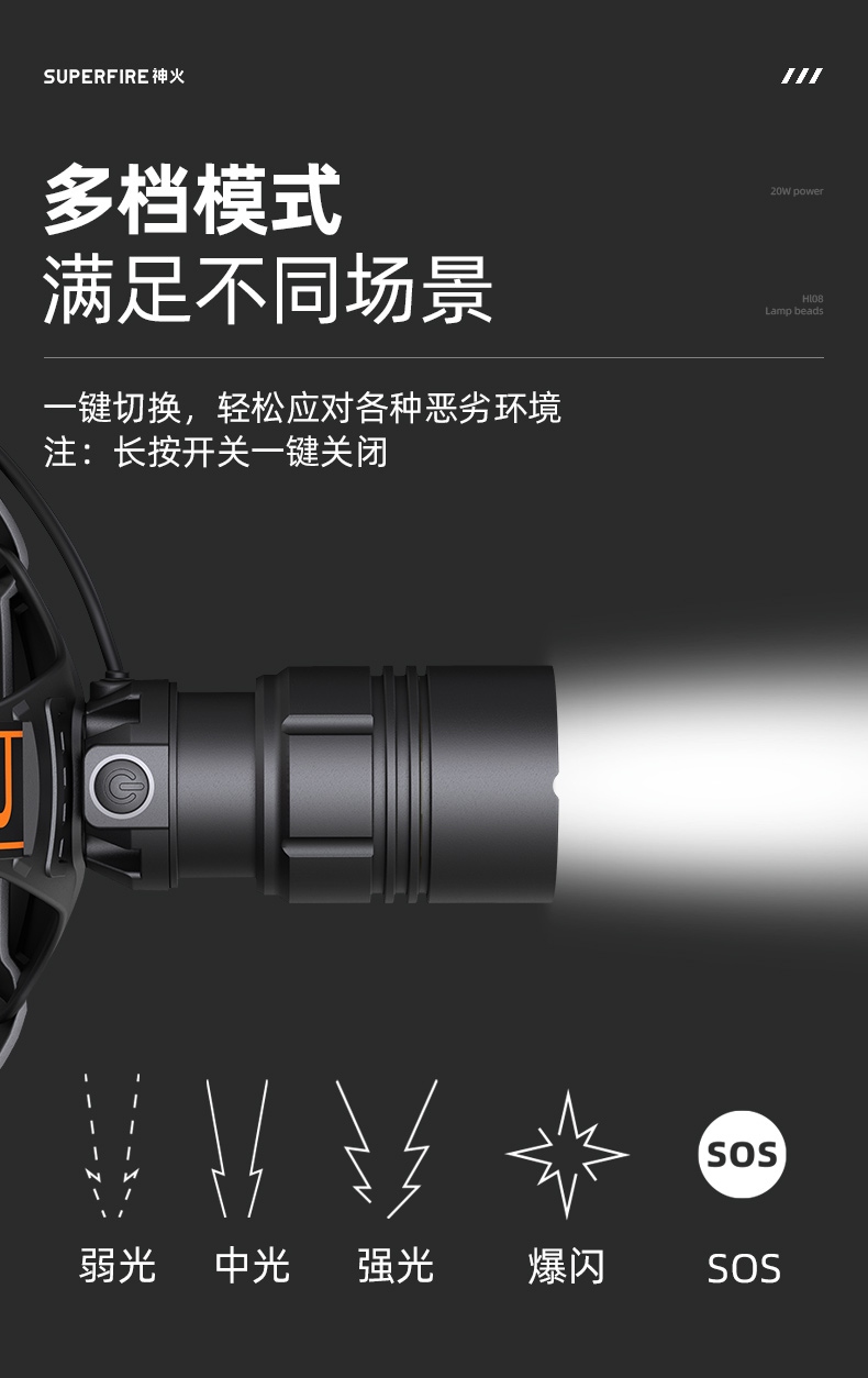 1、多檔調光,可滿足不同使用場景下的照明需求; 2、含提手,握感更舒適。攜帶更簡單; 3、新型高亮遠射燈珠,60W大功率,亮度高,照明效果好。