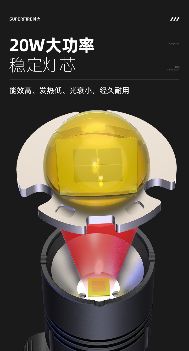 1、大尺寸鋁合金光杯,光斑更圓潤。 2、新型高亮遠射燈珠,40W大功率,亮度高,照明效果好。