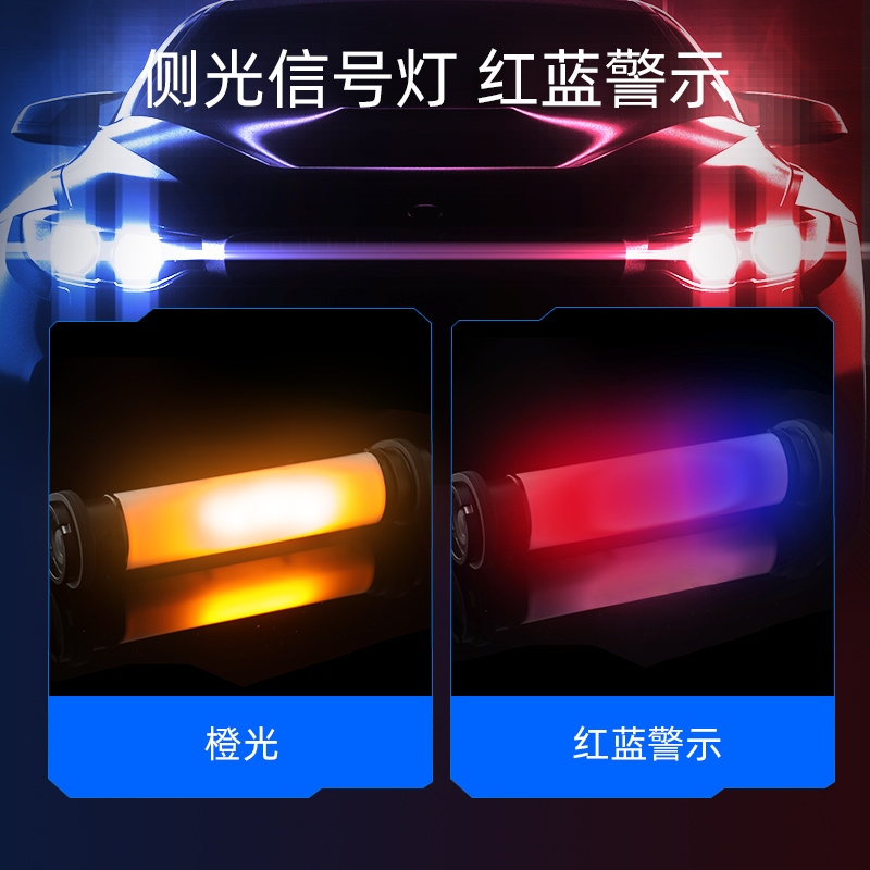 輕按側邊開關按鈕,側邊橙光點亮,續按依次切換為紅藍交替警示光。