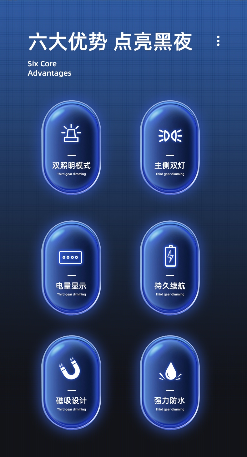 六大優勢 點亮黑夜 雙照明模式 主側雙燈 電量顯示 持久續航 磁吸設計 強力防水