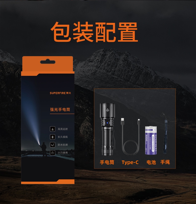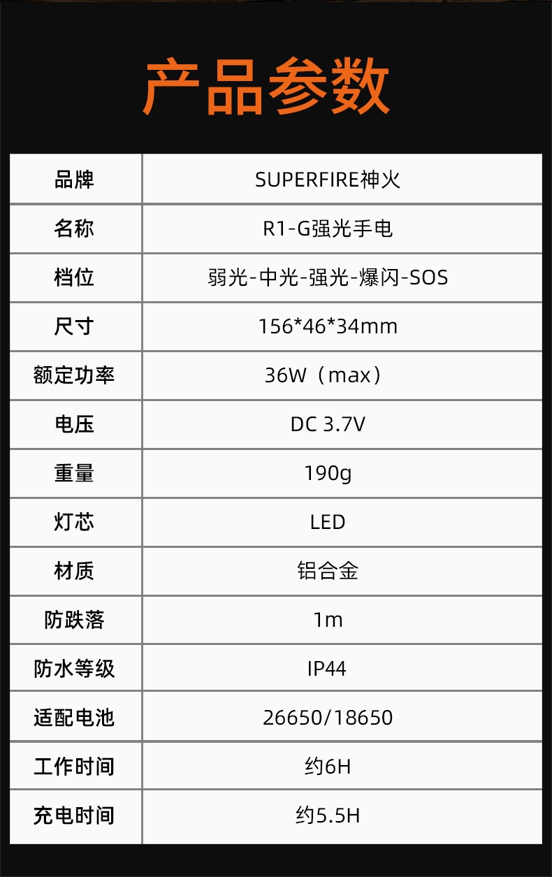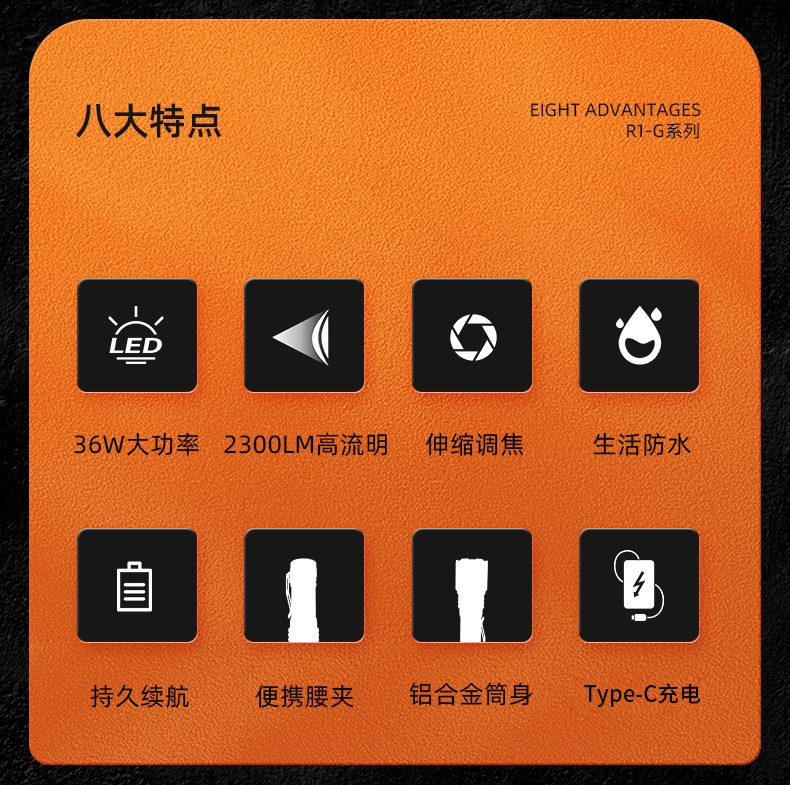 1、多檔調光,可滿足不同使用壞境下的照明需求。2、推拉燈頭可實現伸縮調焦。3、鋁合金筒身,防水耐摔。4、36W大功率,亮度高,照明效果好。5、最高約6H續航,有效滿足長時間照明使用