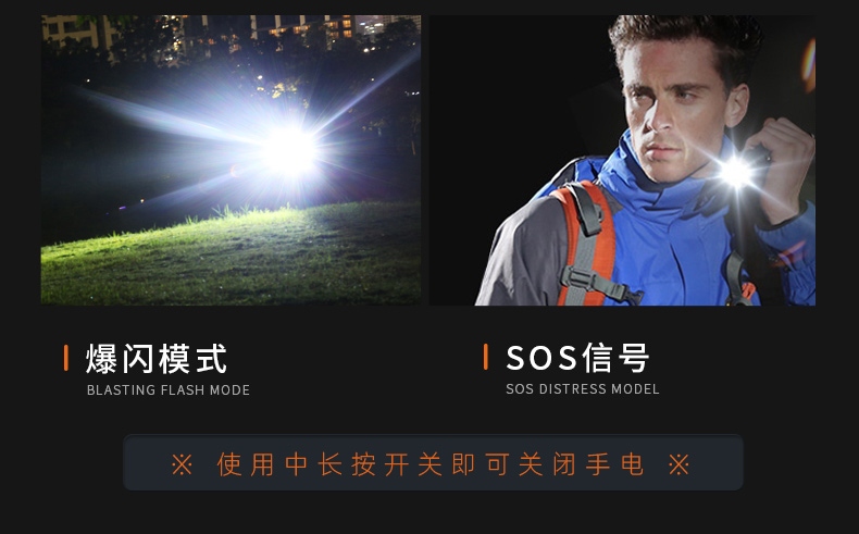聚光主燈 亮度隨心 輕按后端開關按鈕,主燈強光點亮,續按依次切換主燈工作光-爆閃光。主燈開啟狀態下長按5秒,可實現光源色溫轉換。主燈關閉狀態下長按5秒,可開啟燈具最亮照明模式。 爆亮強光 亮如白晝 1500LM大功率高亮光源,點亮頃刻如白晝
