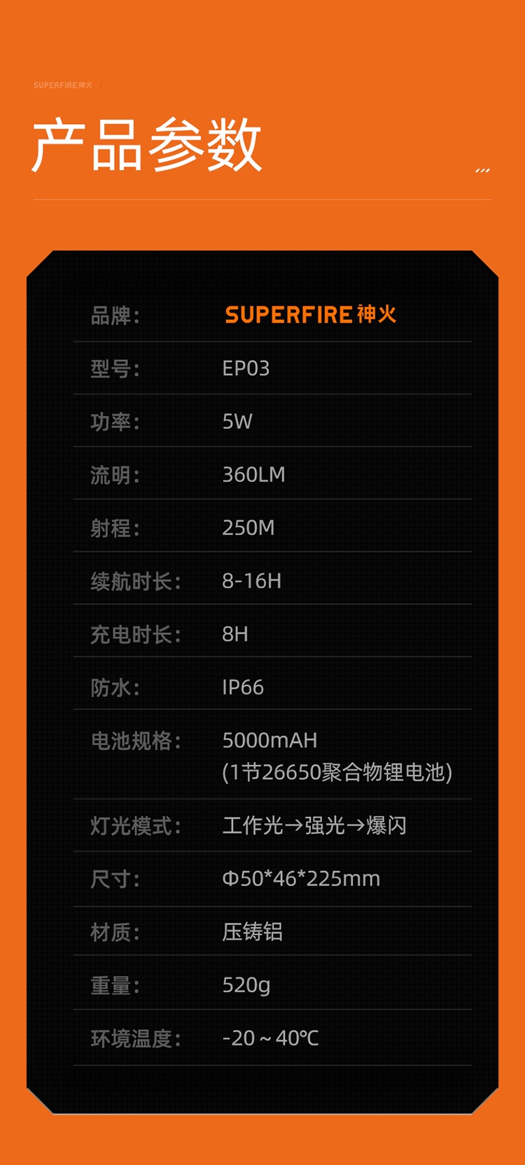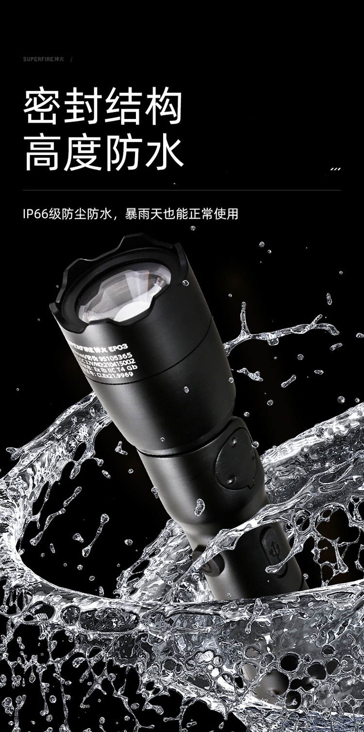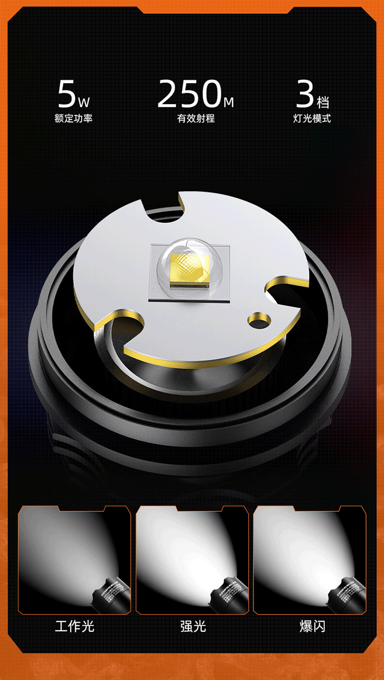 聚光主燈 亮度隨心 輕按后端開關按鈕,主燈強光點亮,續按依次切換主燈工作光-爆閃光。主燈開啟狀態下長按5秒,可實現光源色溫轉換。主燈關閉狀態下長按5秒,可開啟燈具最亮照明模式。 爆亮強光 亮如白晝 1500LM大功率高亮光源,點亮頃刻如白晝