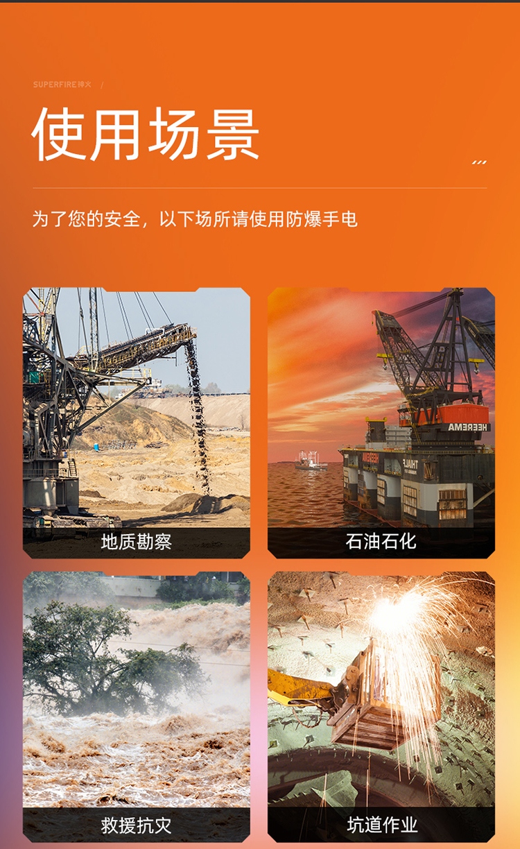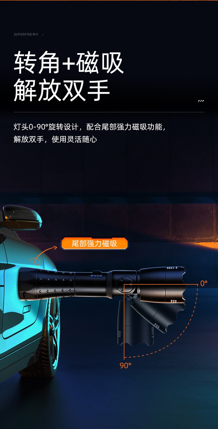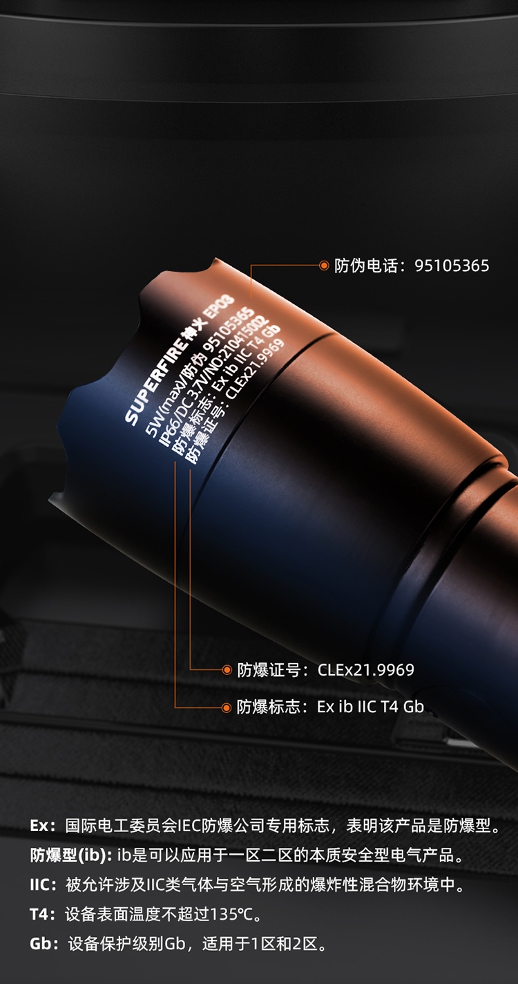 1、手持式防爆手電防爆標識Ex ib IIC T4 Gb,防爆認證使用更放心; 2 、燈頭0-90度直角旋轉,尾部帶吸磁功能,可調焦距,滿足您各種不同使用場景; 3、燈具設有4顆電量指示燈,當電量剩10%以下時指示燈1顆頻閃,燈光自動連續閃爍3次,表示燈具電量嚴重不足
