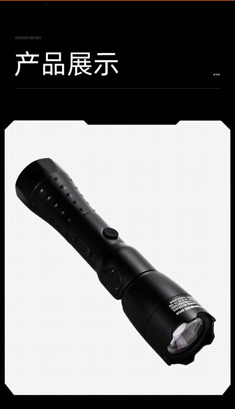 1、千米遠射,射程更遠,光斑更聚焦。 2、進口燈珠,亮度高,照明效果更好。 3、前后雙按鍵,光源一鍵點亮,高亮瞬間開啟。