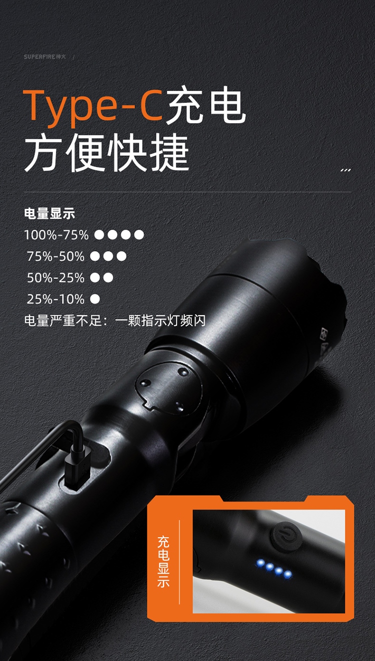 四檔調光 Type-C充電 電量顯示 鋁合金筒身 持久續航 強力防水